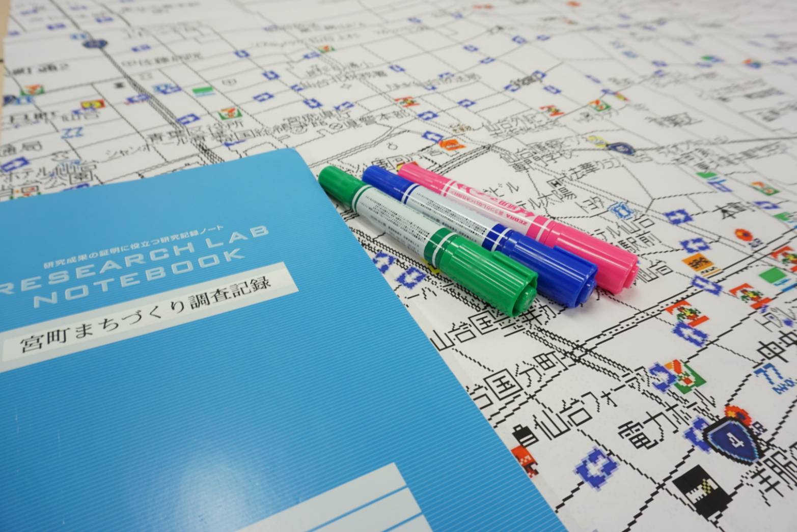 机上に宮町商店街の地図を広げ、ゾーニングをし、次回に予定されているフィールドワークの相談を行いました。