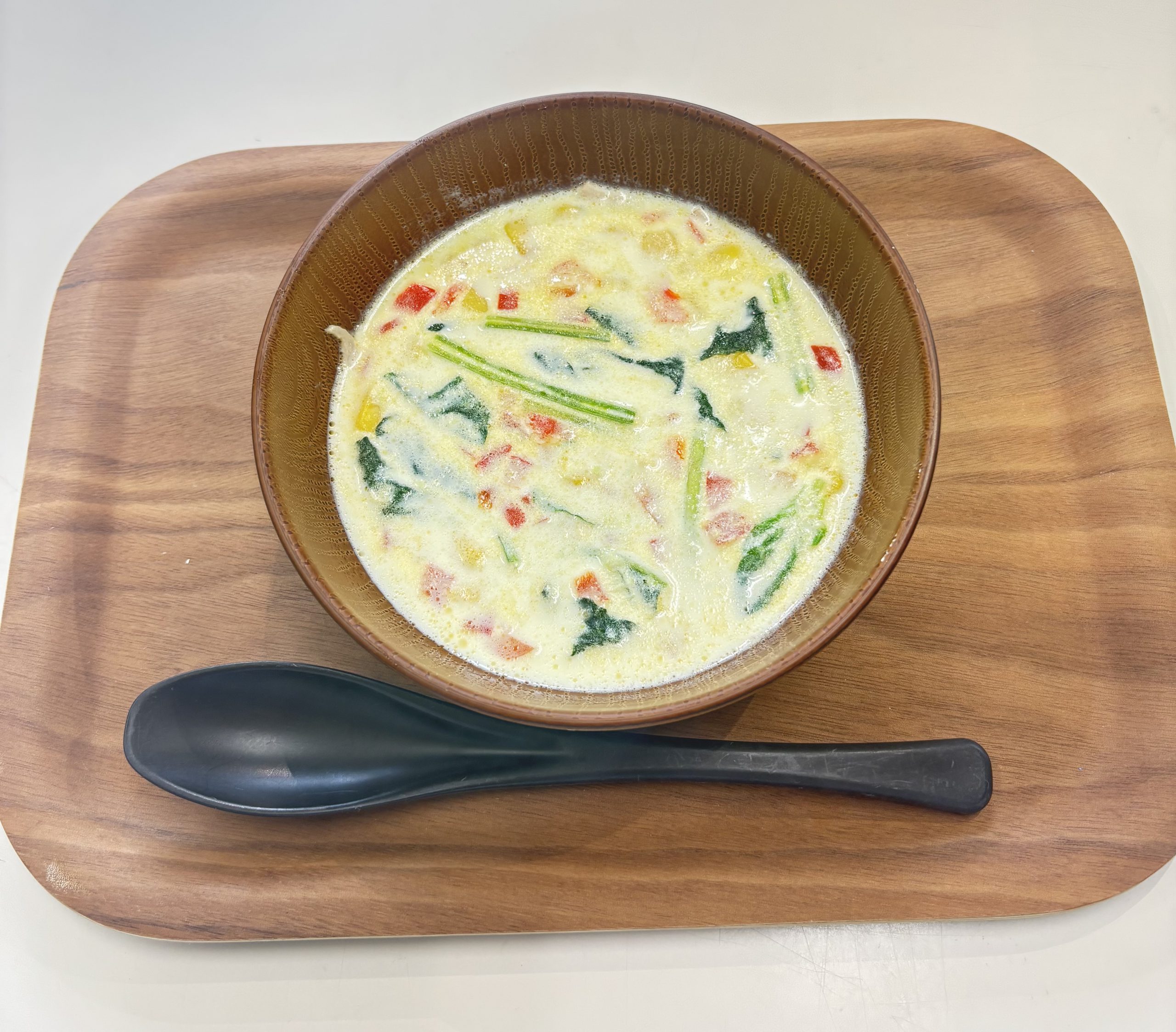 「<作品特長> 宮城県産の食材をぎゅっと詰め込んだ体も心もあたたまるクリームスープです。宮城県産の枝豆から作ったずんだの素朴な甘さに、宮城県が全国生産量1位のパプリカの華やかな香りと、ほうれんそうのさわやかな風味を重ねました。また、パプリカの赤と、ほうれんそうの緑、コーンの黄色で仙台七夕まつりの鮮やかな色彩を表現し、味覚だけでなく視覚でも宮城の豊かさを感じられるスープに仕上げました。」