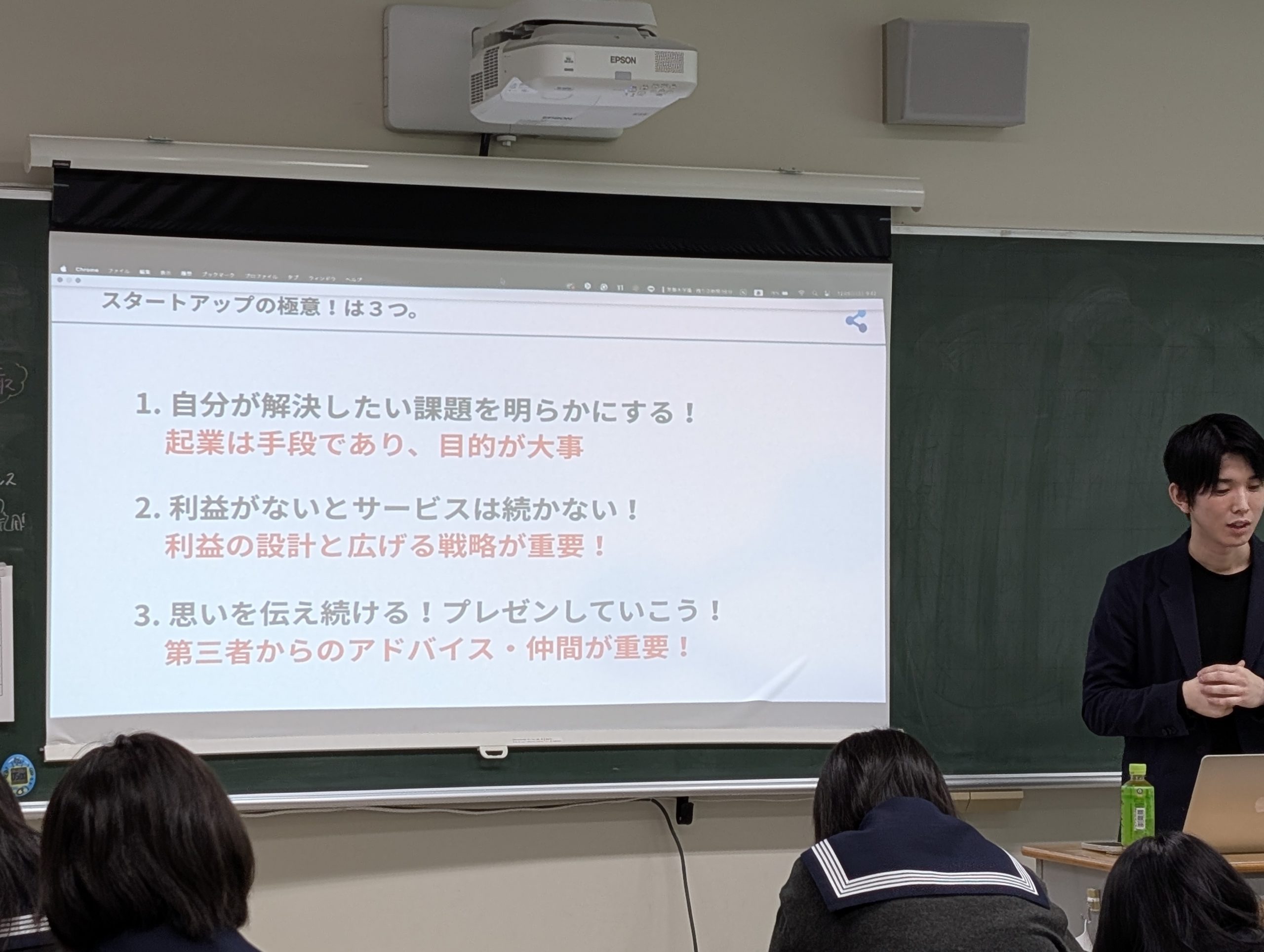 ご自身の業務内容から起業に至った体験談、解決したい社会課題等、生徒にとっては間違いなく将来の選択肢が広がる講演をしてくださいました。